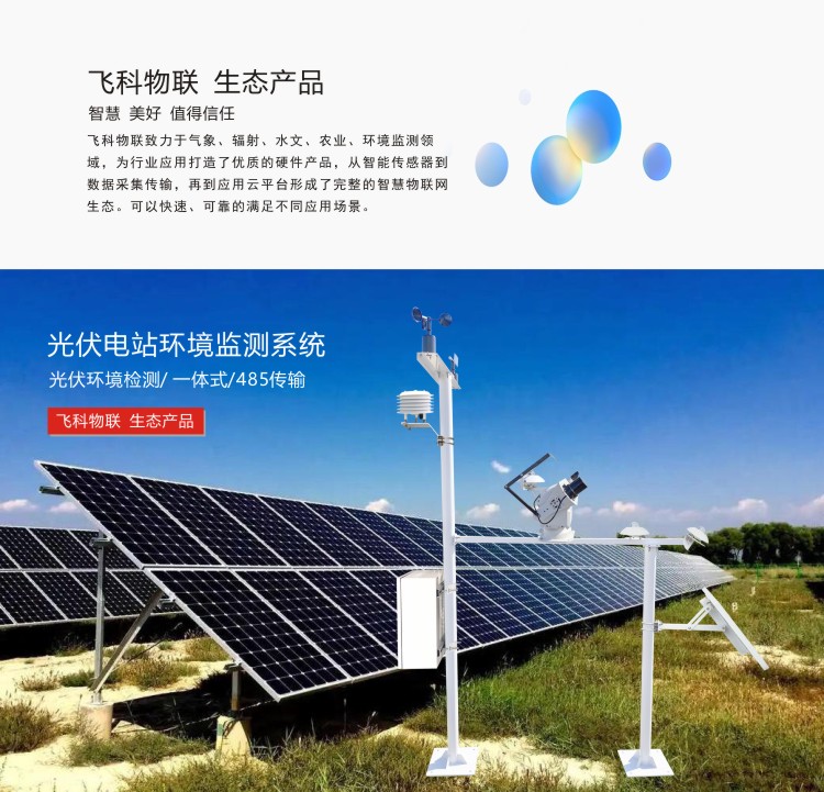 FY-SQ200型光伏电站环境监测系统可观测的环境辐射要素有:环境温度、湿度、气压、组件温度、风速、风向、倾斜总辐射、日照时数、水平总辐射、太阳直接辐射、太阳散射辐射等指标。具有性能稳定,检测精度高,完全自动化监测等特点,可满足光伏电站环境气象监测、太阳辐射监测等相关要求。