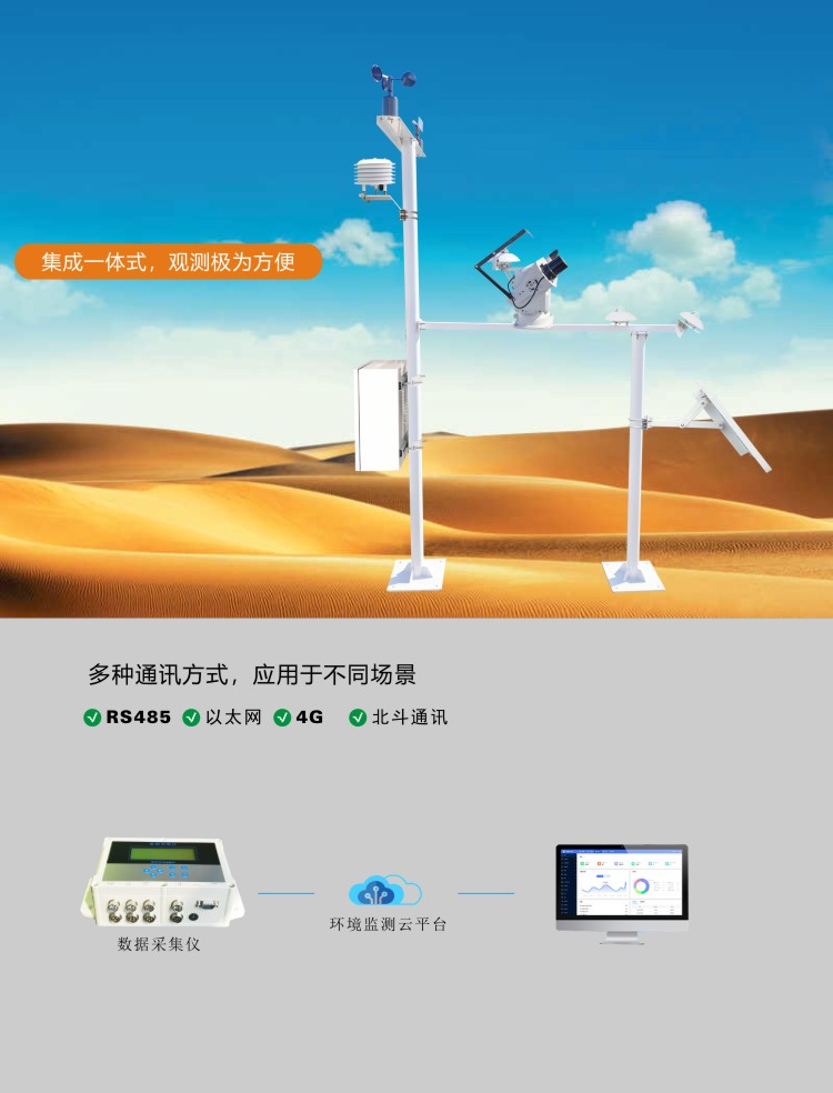 ●标准RS232/485/USB通讯功能,支持标准MODBUS通讯协议,可以通过有线 连接、局域网连接、光纤连接、GPRS移动通讯、数传电台、等多种通讯方式与光伏气象站接收服务器组成气象监测系统;
