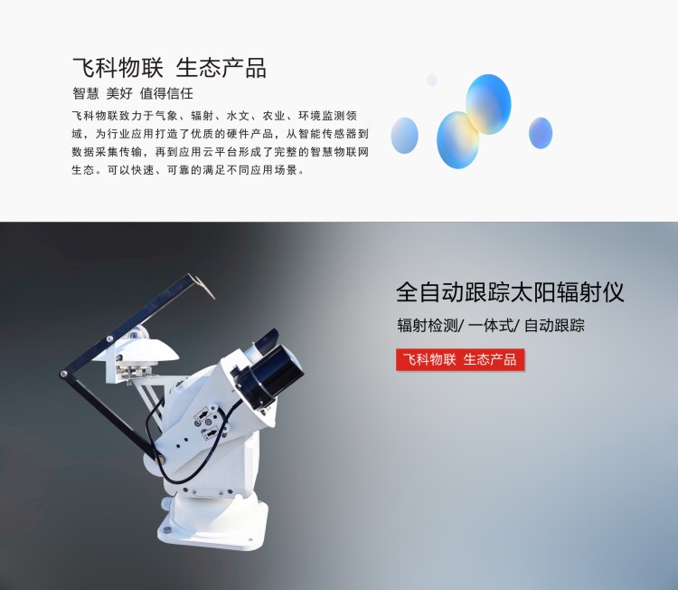 FY-AS2全自动跟踪太阳辐射仪用于自动测量太阳直接辐射以及散射辐射。仪器采用高灵敏度阳光传感器以及自动跟踪装置,可自动实时精确跟踪太阳方位,实现太阳直接辐射值以及散射辐射的同步测量。本传感器可应用于气象探测、太阳能利用、农业、建筑物理研究、生态监测考察部门。