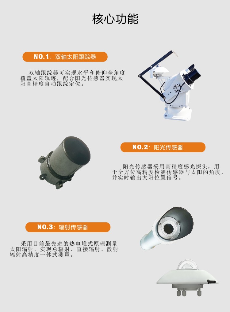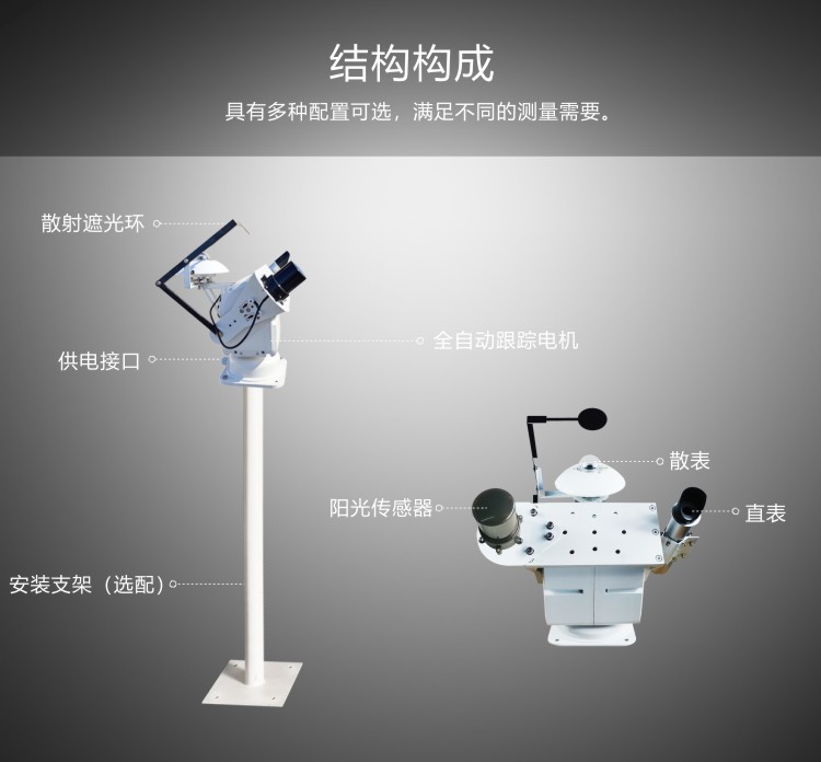 ●一体式测量太阳总辐射,直接辐射,散射辐射等;