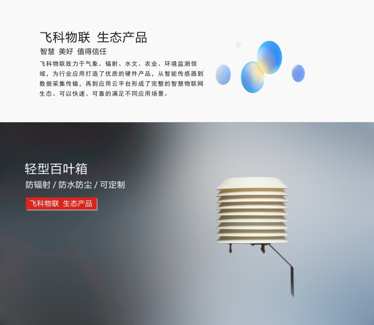 FY-FPMAX轻型百叶箱又称防辐射罩、通风罩,能防止太阳对仪器的直接辐射和地面对仪器的反射辐射,保护仪器免受强风、雨、雪等的影响。并且其特殊的表面处理和结构设计,抗紫外辐射性能好,耐腐蚀性强,通风性好,可用于温湿度传感器室外防辐射。