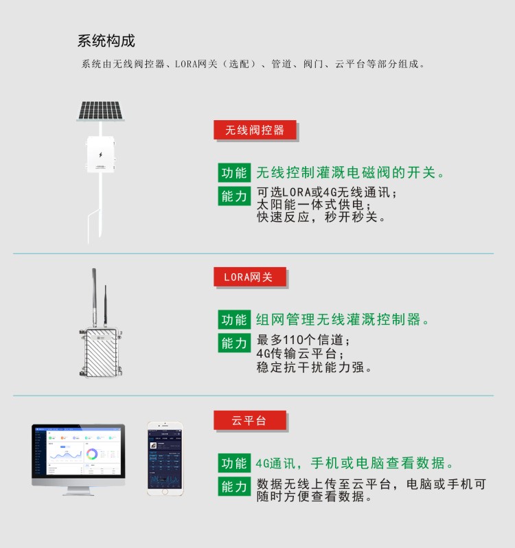 FY-WT800型无线阀控器专门用于自动灌溉控制,采用基于扩频通信的超远距离、可选用4G或低功耗LoRa无线传输技术,实现对灌溉设备的统一管理和远程控制。具有节水,高效,节省人工的特点,精准调控,提高了水资源利用率,节水可达16%-30%。