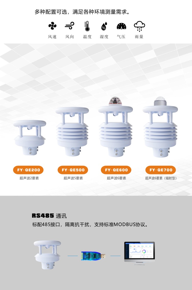 FY-QE200超声波风速风向传感器采用高频超声波来测量风速和风向,解决了传统机械式测风仪机械磨损的难题,没有移动部件,测量精度更高,性能更加可靠。超声波探头可以精确测量出风速和风向。传感器具有4个超声波探头。两个探头一组,进行相互收发。在无风的环境下,从每一个探头发出的超声波到达对面探头的时间都是一样的;当有风的情况下,风会影响超声波到达对面探头的时间,通过计算探头之间超声波传输时间差,可以计算出当时的风速和风向。可实现户外气象参数24小时连续在线监测,通过数字量通讯接口将气象参数一次性输出给用户。