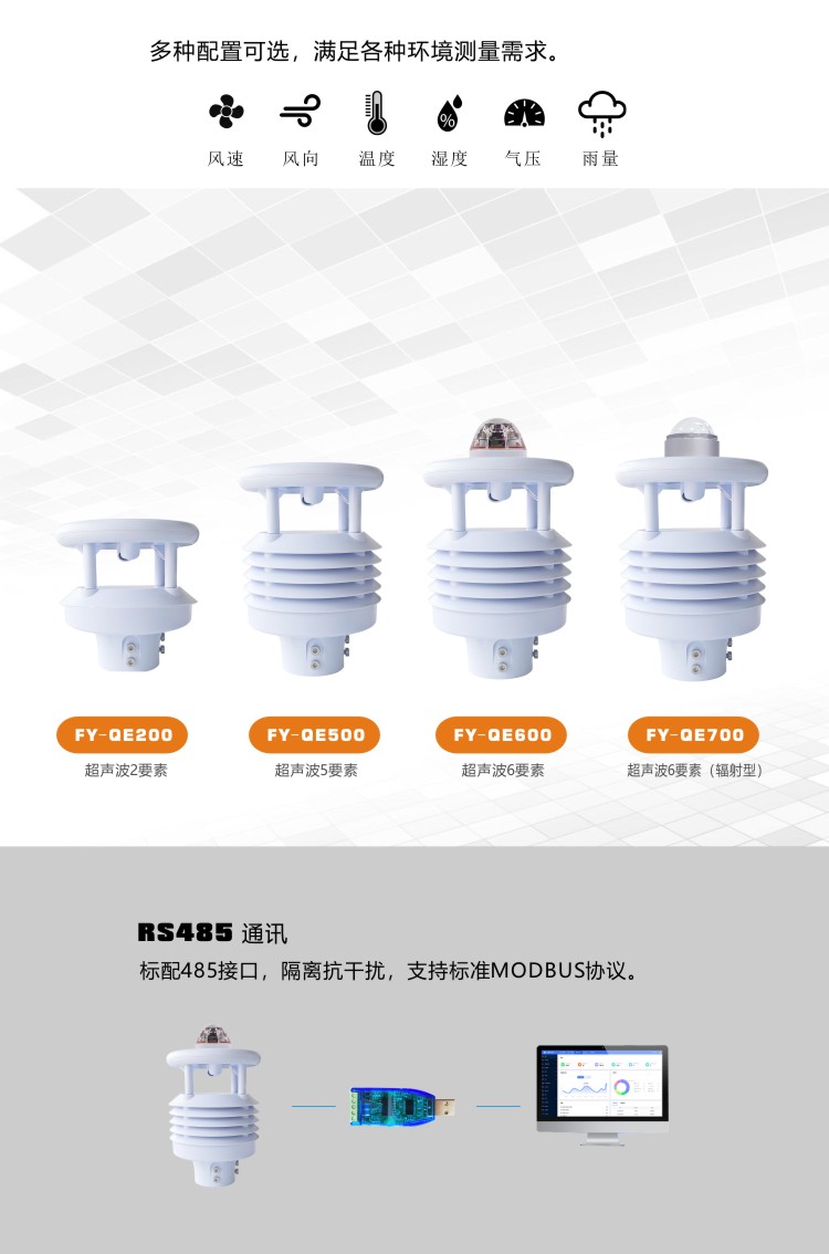 FY-QE600超声波6要素传感器采用超声波原理,一体式结构可对风速、风向、温度、湿度、气压、雨量等进行同步测量。采用高精度传感元件作为感应部件,具有测量精度高、稳定性好等特点,传感器采用先进的电路集成模块,可根据用户的不同需求输出RS232、RS485、4G等通讯方式传输。仪器体积小巧,安装方便且便携,性能可靠;可广泛应用于气象观测、环境控制、农业、工厂等诸多领域。