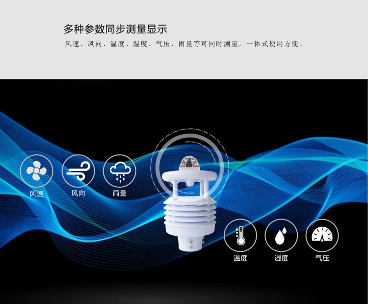 ●风速、风向、温度、湿度、气压、雨量等一体式;