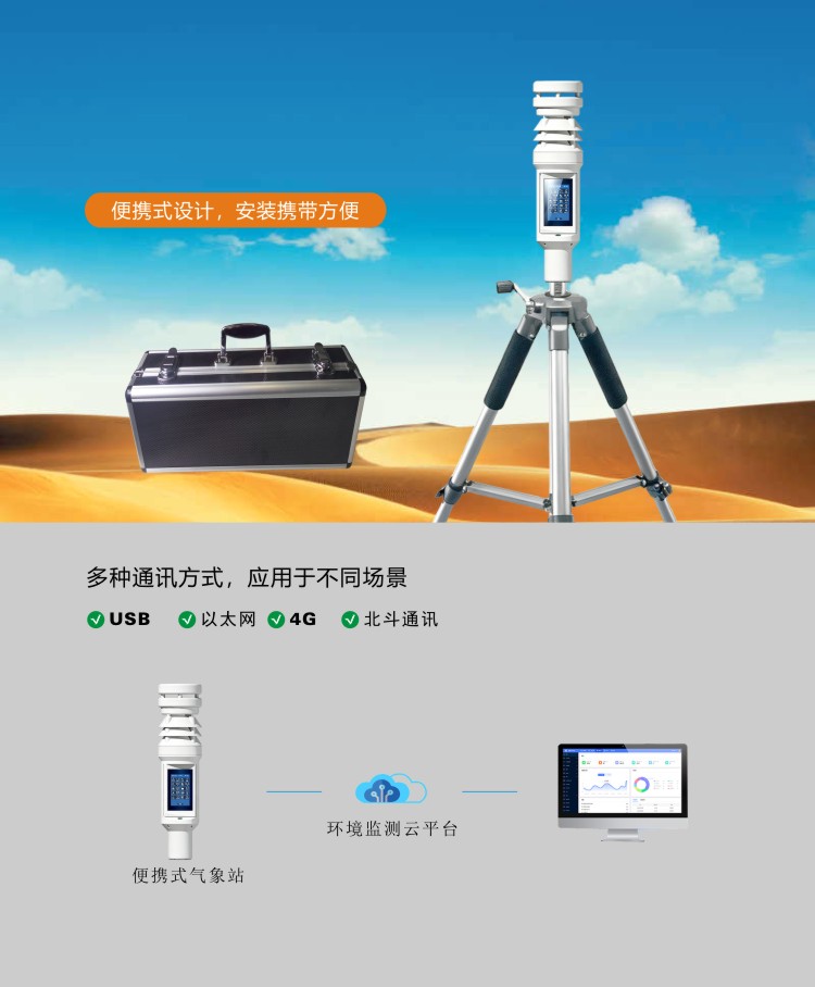 FY-CQ600便携式超声波气象仪是一款携带方便,操作简单,集多项气象要素于一体的可移动式气象观测仪器。系统采用精密传感器及智能芯片,用于测量风速,风向、温度,湿度,露点,大气压力,BF 薄福,风寒指数,海拔高度等数据,并可扩展GPS定位功能。内置大容量FLASH存储芯片可存储至少一年的气象数据;支持有线和无线通讯方式,将数据传输至单机软件或云平台,方便用户对气象数据的进一步处理分析。本仪器具有免调试、可折叠伸缩、自带可充式电源等特点,使其非常适用于各类应急临时气象短期观测、长期连续的小型气象监测和移动气象监测等各类气象数据的获取。