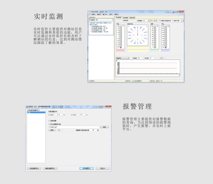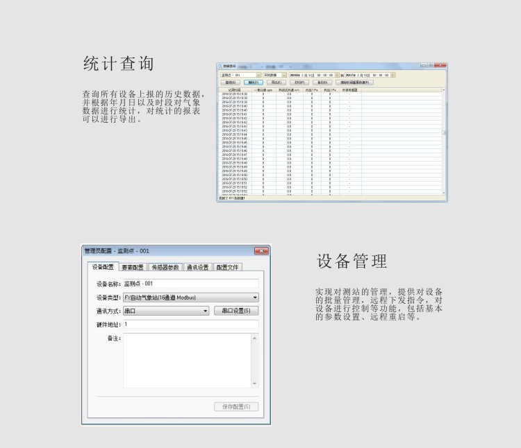 软件介绍 综合环境监测客户端软件是针对我国气象农业环境观测所开发的终端前置软件,它主要用于接收终端设备数据、保存管理历史数据、对采集的数据进行图表化显示、数据的分类统计、远程管理监测设备、告警信息发布,并提供数据同步等功能。平台软件结构分为:数据通讯程序、数据库、业务数据组件、网管组件、数据同步平台以及WEB页面服务程序。