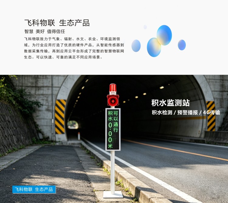FY-WSC1000城市积水监测预警系统主要由采集终端、通讯模块、电源模块、信息显示屏等组成。该一体站在内涝发生时根据预先设定的参数采集内涝积水的准确数据信息,经过本地存储、数据处理以及协议封装等,由通讯模块将数据信息发送到监测中心,同时将检测到的道路水位信息更新至信息显示屏,提醒过往行人和车辆注意安全。