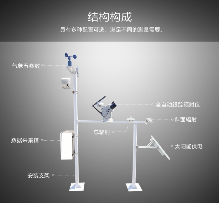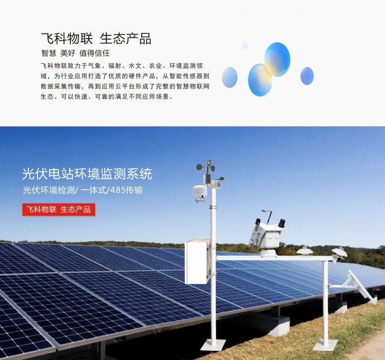 FY-SQ200型光伏电站环境监测系统可观测的环境辐射要素有:环境温度、湿度、气压、组件温度、风速、风向、倾斜总辐射、日照时数、水平总辐射、太阳直接辐射、太阳散射辐射等指标。具有性能稳定,检测精度高,完全自动化监测等特点,可满足光伏电站环境气象监测、太阳辐射监测等相关要求。