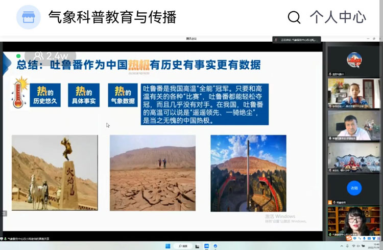 为做好科普向未来工作和进一步推动全国中小学气象科普知识进校园活动,丰富孩子们的科普知识,并收获更多快乐和见闻;在中国科普研究所和中国气象学会主办下,由河南、新疆、安徽气象学会联合湖北公众气象服务中心以及相关地区气象局、教育部门、学校等多部门联合共同开展《探秘我国热极气象 云游火焰山》为主题的气象科普知识直播课程活动。邀请新疆公众气象服务中心苏小岚高级工程师、编导为大家带来《探秘我国热极气象 云游火焰山》授课,带我们一起学习新疆地域气象特点,感受探寻吐鲁番气候特点和人文景观以及丝绸之路。