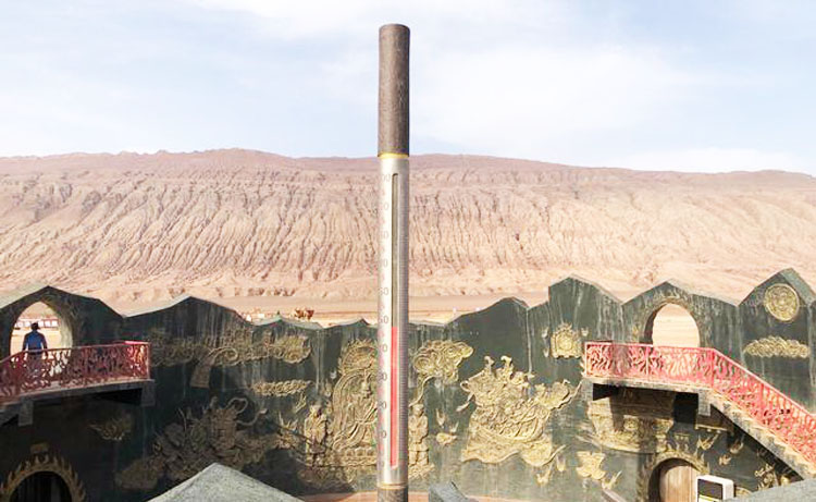 从地宫出来,看到最出名的“金箍棒”温度计,高12米,是吉尼斯纪录里最大的立式温度计。继续走,能看到牛魔王、铁扇公主和孙悟空护送唐三藏取经的雕像。远处,是火焰山独有的地质风貌,山上荒凉贫瘠,无花草鸟木的身影,当真是三味真火烧过的痕迹。