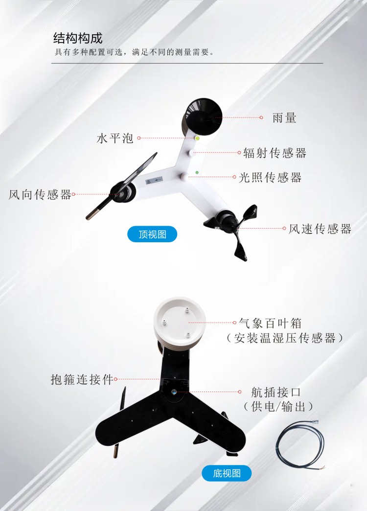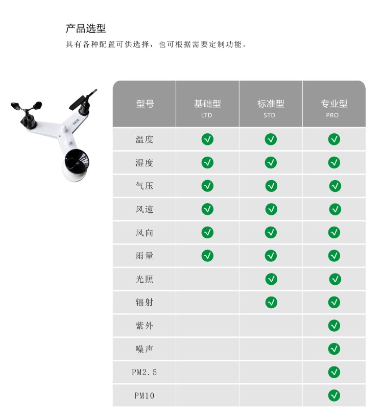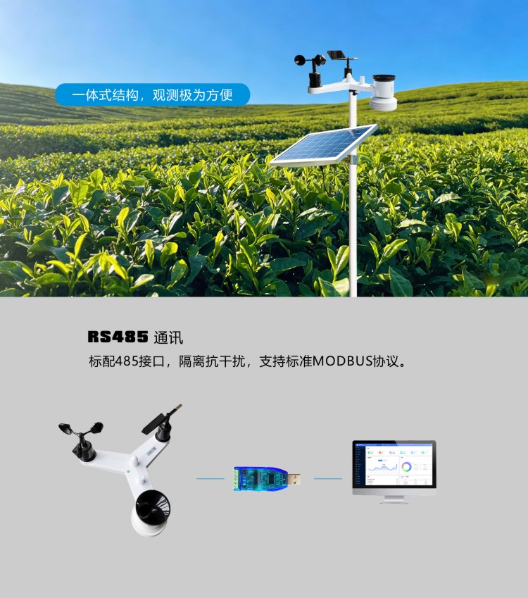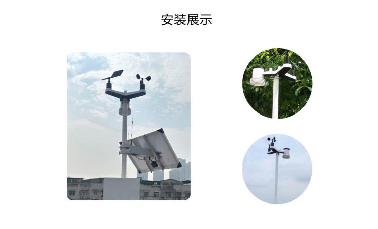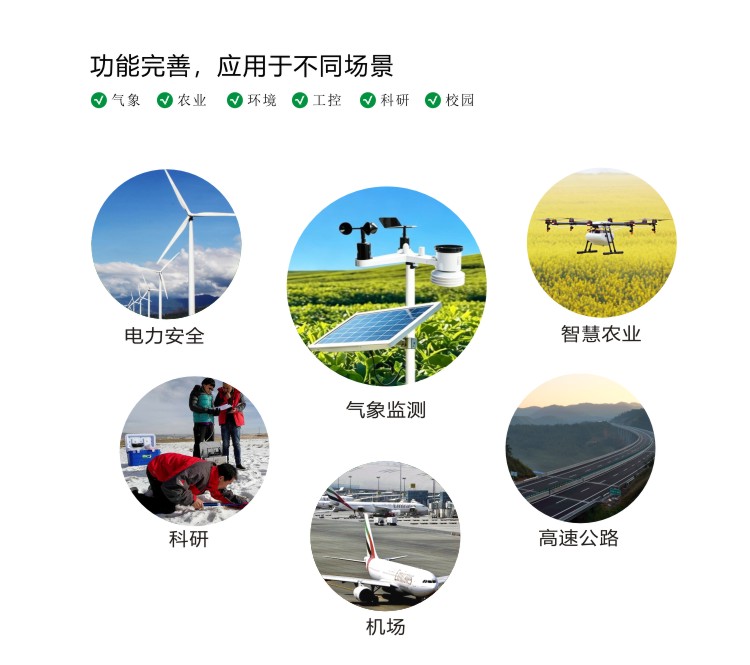 ●测量风速、风向、温度、湿度、气压、雨量、光照、紫外、辐射、PM2.5、PM10、噪声等;