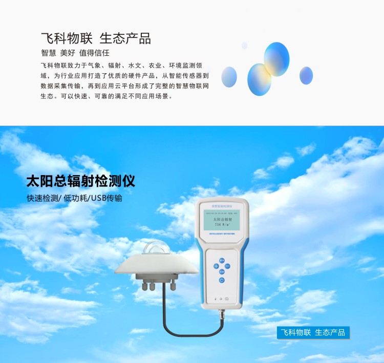 FY-TH400太阳辐射检测仪是一款携带方便,操作简单的便携式环境检测设备。低功耗大屏液晶时显示太阳辐射值,选配相应探头还可测量紫外及光合有效辐射。内置大容量FLASH存储芯片可存储4万条历史数据;通用USB通讯接口,使用配套的USB线缆即可将数据下载到电脑,也可通过4G将数据传输至云平台,方便用户对气象数据的进一步处理分析。