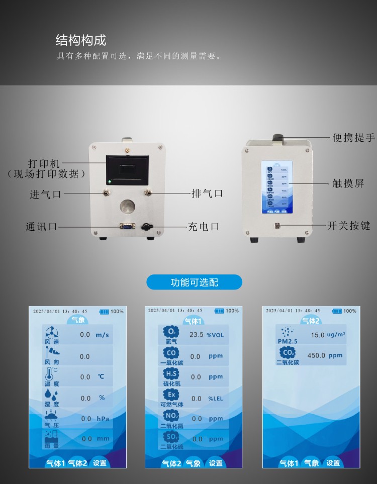 ・监测气体种类:一氧化碳CO、硫化氢H2S、氧气O2、可燃气体Ex、二氧化碳CO2、二氧化氮NO2、二氧化硫SO2、粉尘颗粒物PM2.5、PM10等;