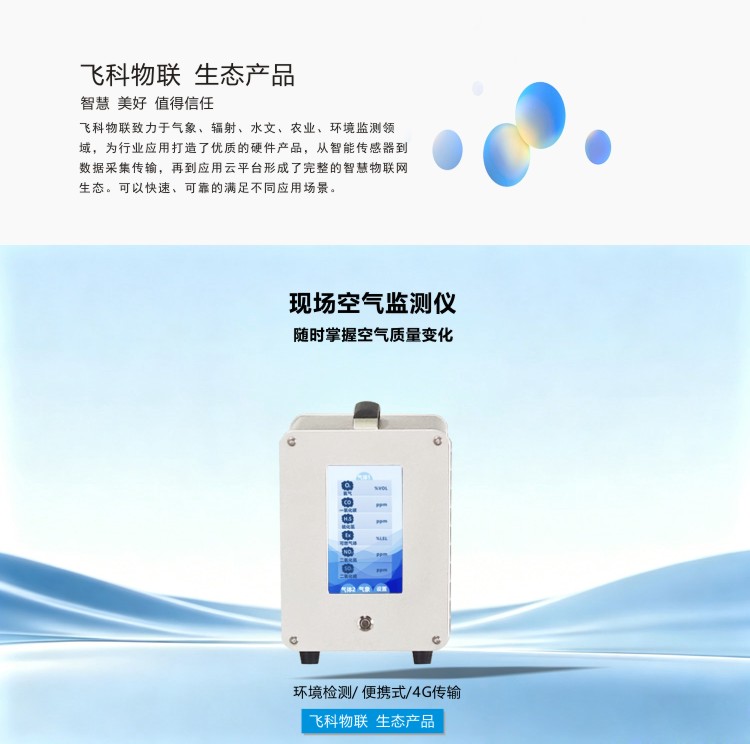 FY-AQ500 现场空气监测仪是一款应用于现场空气质量监测的便携式环境仪器。可监测一氧化碳CO、硫化氢H2S、氧气O2、可燃气体EX、二氧化碳CO2、二氧化氮NO2、二氧化硫SO2、粉尘颗粒物PM2.5、PM10等环境要素,还可集成监测空气温湿度、风向、风速、气压、噪声等气象要素。本仪器具有免调试、可折叠伸缩、自带可充式电源等特点,使其非常适用于各类应急空气质量监测。