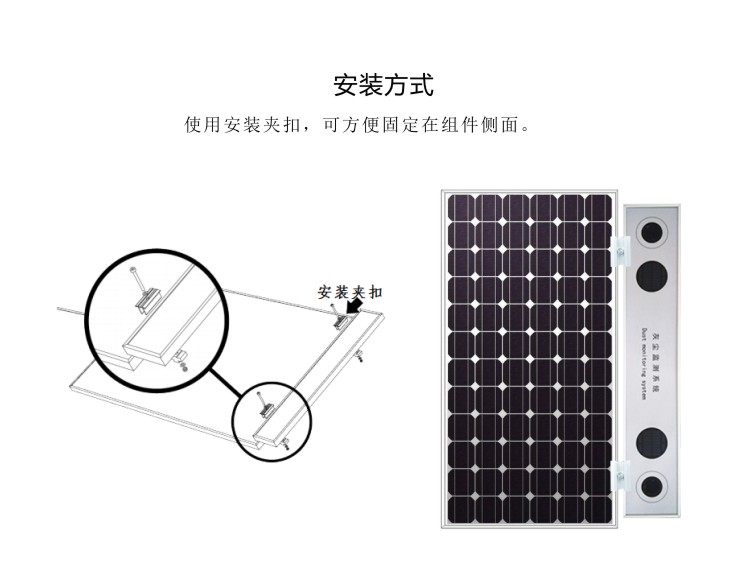 FY-GT2光伏电站灰尘监测系统通过测量污染物的比例(SR),实时转化为发电量的损失。设备采用蓝光闭环测量(OMBP)技术,可以很容易安装到新建或现有的光伏阵列中,并可集成到电站管理系统中。该装置安装在光伏板的框架上,通过连续测量玻璃上污染物带来的传输损耗,从而计算出阳光到达太阳能组件的减少量。运维人员可方便查看污染物是否达到临界点,以便开始清洗程序。该产品不需要维护,只需在清洗周围组件时以同样的方式进行清洗即可。