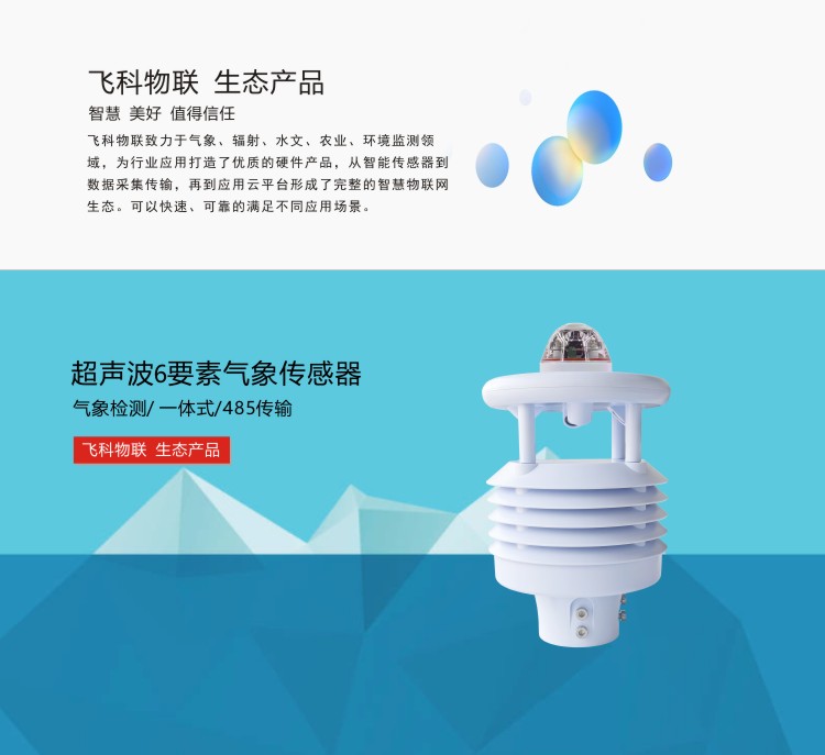 FY-QE600超声波6要素传感器采用超声波原理,一体式结构可对风速、风向、温度、湿度、气压、雨量等进行同步测量。采用高精度传感元件作为感应部件,具有测量精度高、稳定性好等特点,传感器采用先进的电路集成模块,可根据用户的不同需求输出RS232、RS485、4G等通讯方式传输。仪器体积小巧,安装方便且便携,性能可靠;可广泛应用于气象观测、环境控制、农业、工厂等诸多领域。