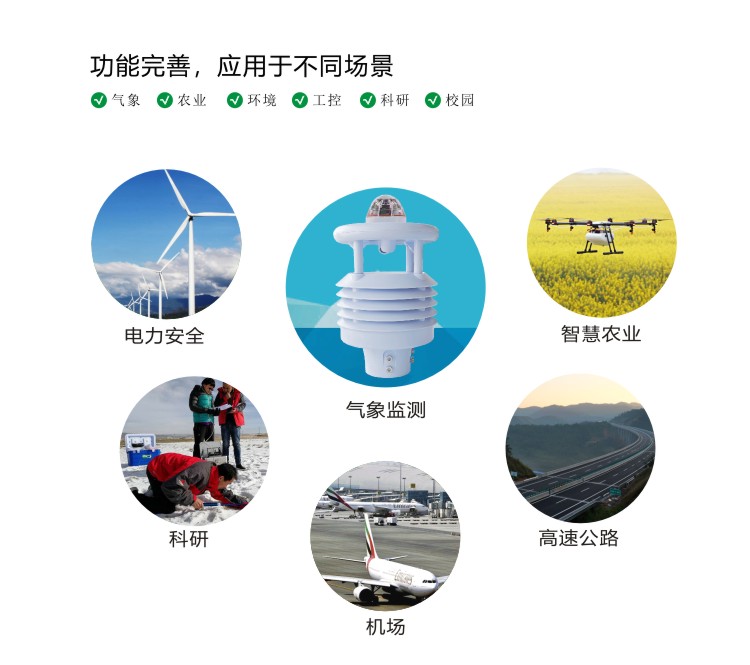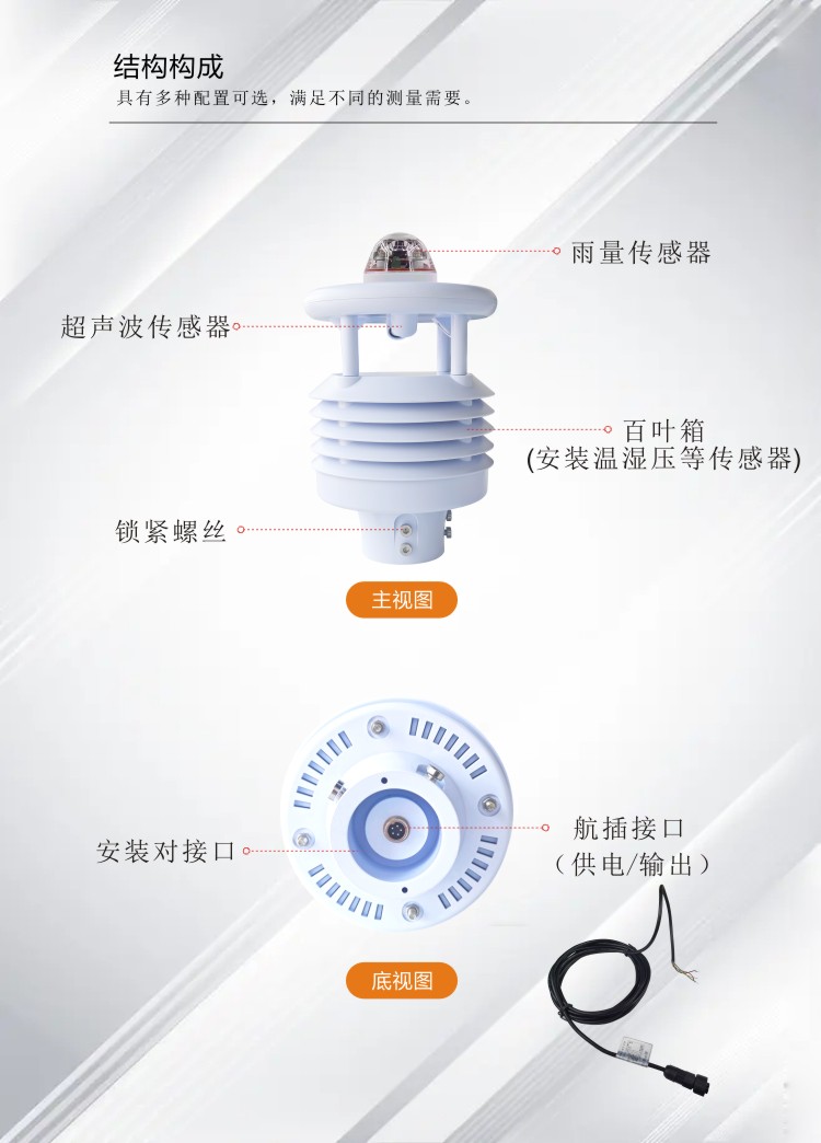 ●风速、风向、温度、湿度、气压、雨量等一体式;