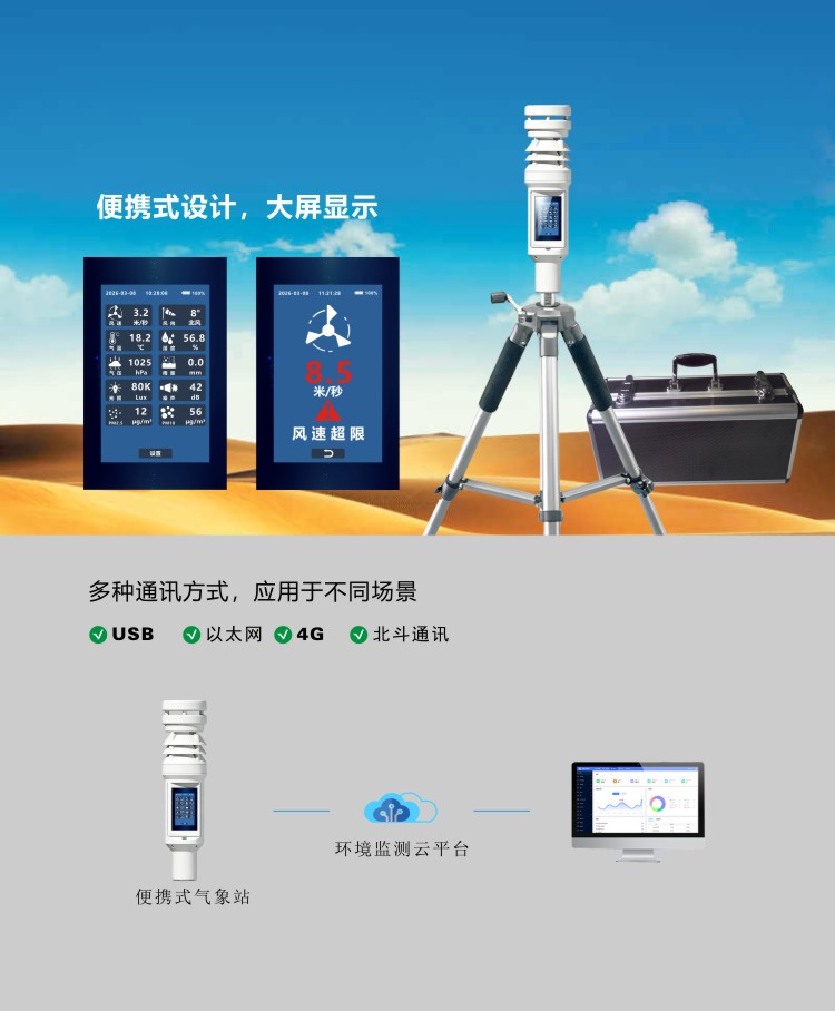 ・可同时监测风速、风向、温度、湿度、气压等气象参数;
