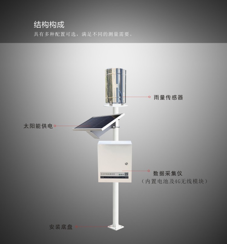 FY-WL100自动雨量站是用于测量雨量水文信息的自动观测仪器。自动雨量站由数据采集仪、雨量传感器、无线通讯模块、太阳能供电系统、云平台软件等部分构成。数据采集仪用于采集及记录雨量信息,并通过4G无线模块向云平台上报数据,系统采用一体式设计,安装方便。