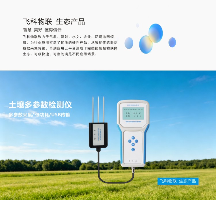 FY-TH100土壤多参数检测仪是一款携带方便,操作简单的便携式土壤检测设备。低功耗大屏液晶,可同时显示土壤温度、土壤水分、土壤盐分、土壤电导率、PH等,内置大容量FLASH存储芯片可存储9万条历史数据;通用USB通讯接口,使用配套的USB线缆即可将数据下载到电脑,也可通过4G将数据传输至云平台,方便用户对气象数据的进一步处理分析。